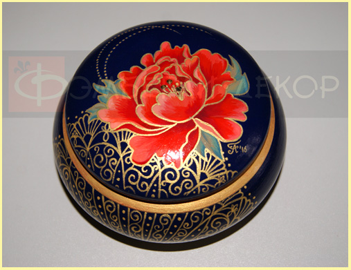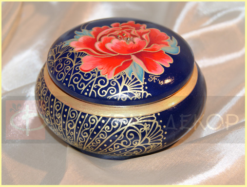 ОПИСАНИЕ: Шкатулка расписана итальянскими акриловыми красками и декорирована стразами Сваровски. Сверху изделие покрыто глянцевым акриловым лаком. Эта изысканная шкатулка с авторской росписью станет отличным подарком для ценителей эксклюзивных предметов интерьера. Для сохранения уникальности каждой работы 100% повтор не выполняется. РАЗМЕРЫ: Диаметр 110 мм СТАТУС: На заказ СТОИМОСТЬ: вернуться в раздел Заказать |