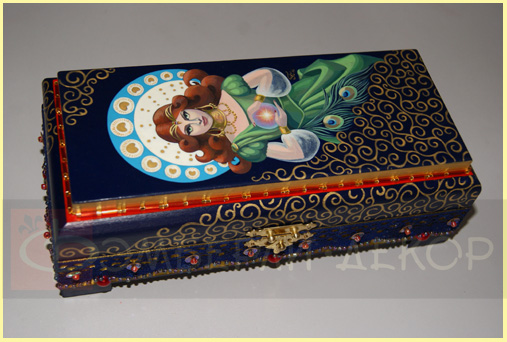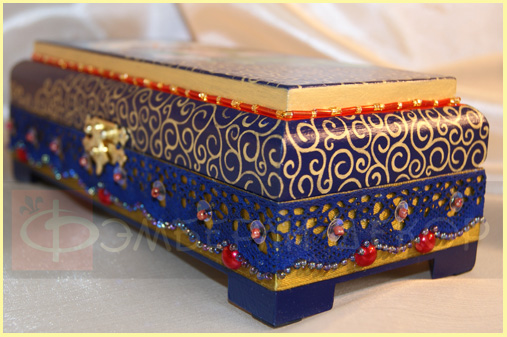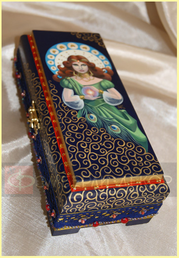 ОПИСАНИЕ: Шкатулка расписана итальянскими акриловыми красками и покрыта матовым акриловым лаком. Изделие декорировано кружевом, атласными лентами, бисером, пайетками, перламутровыми полубусинами и стразами Сваровски. Эта шкатулка не оставит равнодушным настоящих ценителей предметов искусства. Для сохранения уникальности каждой работы 100% повтор не выполняется. РАЗМЕРЫ: 200*90*65 мм СТАТУС: На заказ СТОИМОСТЬ: вернуться в раздел Заказать |