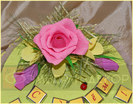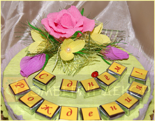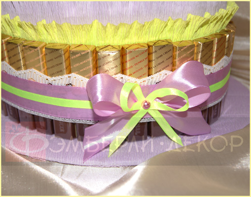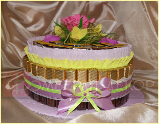 ОПИСАНИЕ: В состав подарка входят следующие сладости: шоколадки «Mersi» - 38 шт., кубики шоколада «O'Zera» - 14 шт. и конфеты «Kinder Bonbons» - 3 шт. В декоре использованы гофробумага, атласные ленты, кружево и бусины. РАЗМЕР: 300*300*150 мм СТАТУС: На заказ СТОИМОСТЬ: 3500 рублей ПОРЯДОК РАБОТЫ: ознакомиться