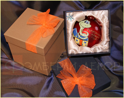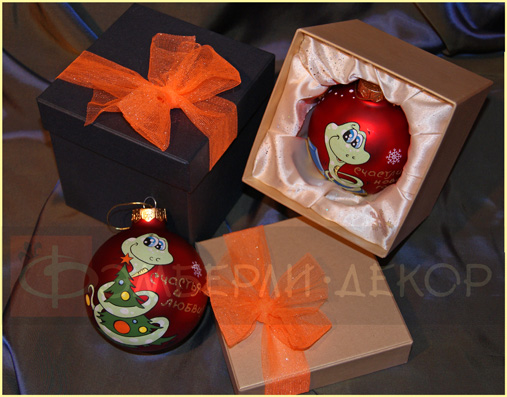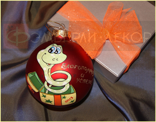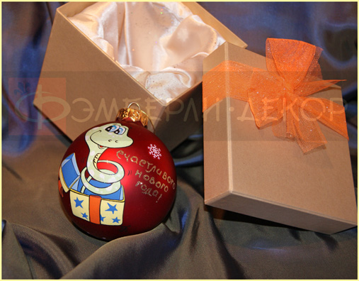 С символом года - ЗМЕЯ #2 ОПИСАНИЕ: Стеклянный новогодний шарик красного цвета расписан итальянскими акриловыми красками и декорирован блёстками. Готовый расписной шарик упакован в красивую подарочную коробочку с декоративным бантиком из фатиновой сетки.