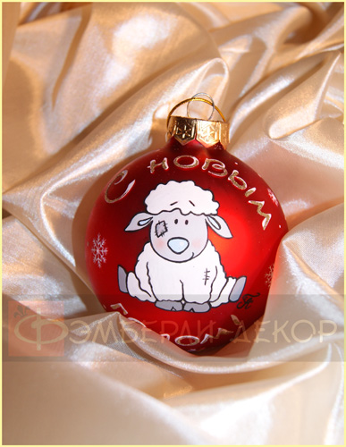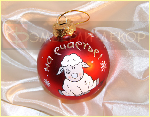 С символом года - КОЗА/ОВЦА #1 ОПИСАНИЕ: Стеклянный новогодний шарик диаметром 80 мм расписан итальянскими акриловыми красками и декорирован блёстками. Готовый расписной шарик упакован в  красивую подарочную коробочку с декоративным бантиком из фатиновой сетки.