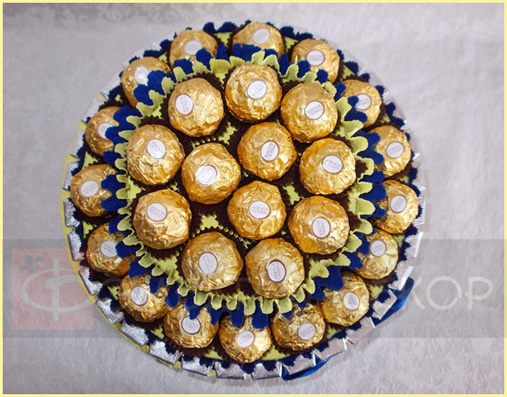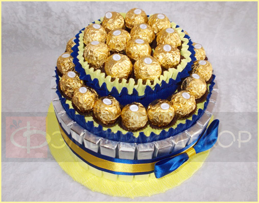 ОПИСАНИЕ: Торт выполнен из вкуснейших шоколадок «Коммунарка» - 32 шт. и конфет «Ferrero Rocher» - 28 шт. В декоре использованы гофробумага и атласные ленты. РАЗМЕР: 260*260*210 мм СТАТУС: На заказ СТОИМОСТЬ: 3800 рублей ПОРЯДОК РАБОТЫ: ознакомиться вернуться в раздел Заказать |