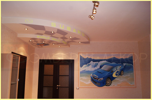 ОПИСАНИЕ: Роспись детской комнаты для мальчика 10 лет выполнена итальянскими акриловыми красками на стене и на поверхности многоуровневого потолка из гипсокартона. Главным сюжетом росписи является любимая марка машины – гоночный автомобиль SUBARU. Для сохранения уникальности каждой работы 100% повтор не выполняется. УСЛОВИЯ РАБОТЫ: ознакомиться СТАТУС: На заказ СТОИМОСТЬ: узнать вернуться в раздел Заказать |