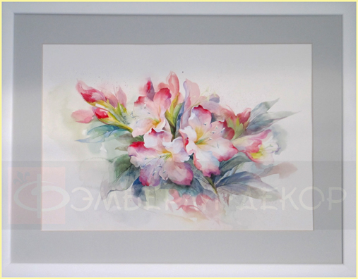 Рододендроны написаны декоративно в нежной цветовой гамме. Изображение выполнено акварелью с акрилом. Работа оформлена в паспарту и под стекло.